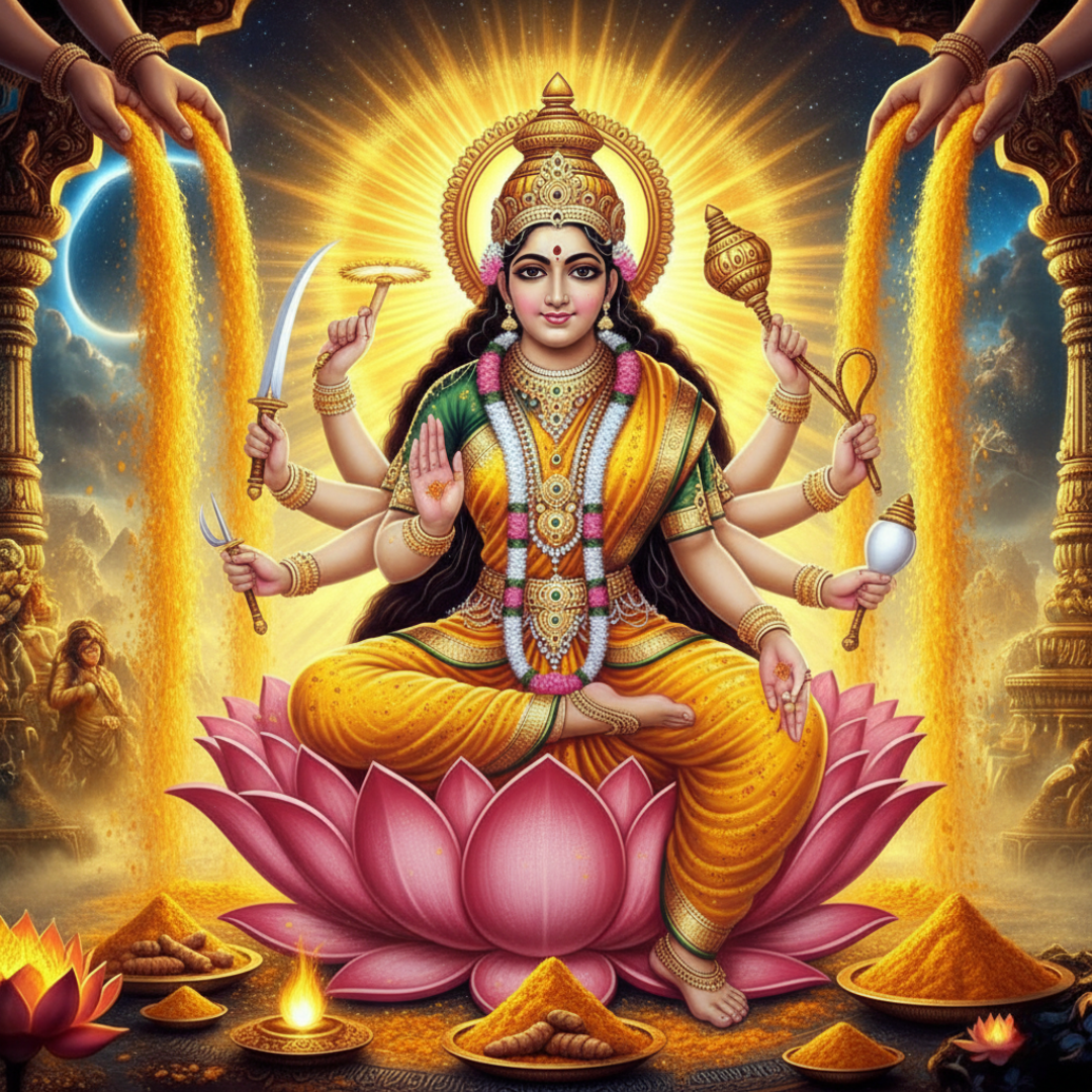 Baglamukhi Turmeric Trishati Puja is a powerful individual ritual dedicated to Goddess Baglamukhi, invoking her protective and stabilizing energies through the chanting of her Trishati (300 sacred names). The ritual is uniquely performed using turmeric (Haridra)—a substance deeply associated with Baglamukhi, symbolizing auspiciousness, protection, authority, and victory.