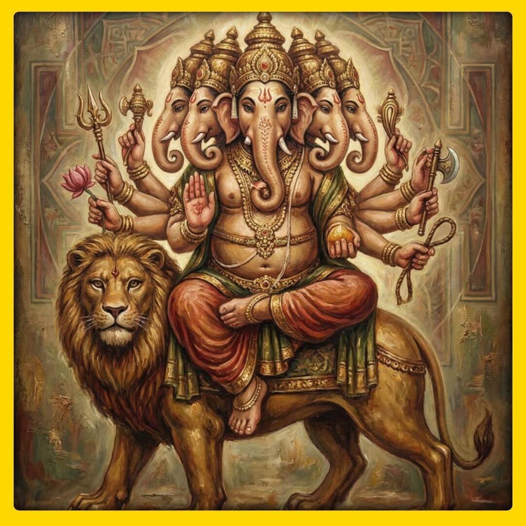 Heramba Ganapati, the five-faced and lion-mounted form of Lord Ganesha, symbolizes fearless protection and strength in adversity. His worship is believed to soften the intense karmic impact of Shani by invoking wisdom, stability, and divine safeguarding. The lion vehicle represents courage and authority, helping devotees withstand Saturn’s testing phases with resilience.